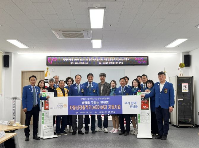 뉴한국방송뉴스통신사 신유철기자 기자 | 국제로타리 3600지구 2025-26 광주지역협의회는 지난 17일 광주시자원봉사센터 4층 교육장에서 자동심장충격기 기증식을 개최하고 500만 원 상당의 장비 2대를 전달했다.