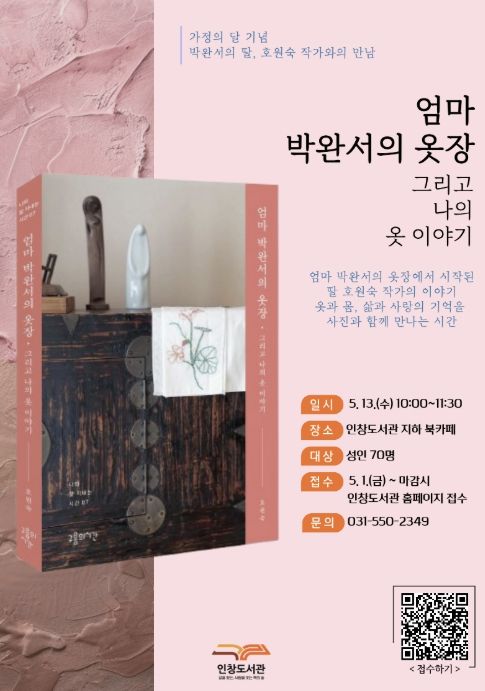 뉴한국방송뉴스통신사 신유철기자 기자 | 구리시립도서관은 '호원숙 작가와의 만남 ‘엄마 박완서의 옷장, 그리고 나의 이야기’' 참여 신청을 오는 5월 1일부터 접수한다고 밝혔다.