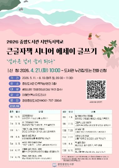 뉴한국방송뉴스통신사 신다은기자 기자 | 광양중앙도서관은 2026년 시민독서학교의 하나로 '큰글자책 시니어 에세이 글쓰기' 프로그램을 운영하고 참여자를 모집한다고 밝혔다.