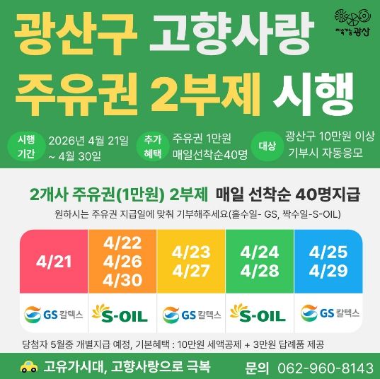 뉴한국방송뉴스통신사 김성의 기자 | 광산구는 지속적인 고향사랑기부 참여를 확대하고 기부자에게 추가 혜택을 제공하기 위해 ‘주유권 2부제 행사’를 마련했다.