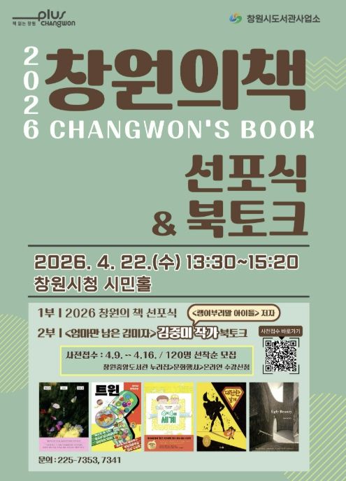 이번 선포식에서 발표될 ‘2026 창원의 책’은 △ 일반 부문: '엄마만 남은 김미자'(김중미 저) △ 청소년 부문: '트윈'(유진서 저) △ 어린이 부문: '4X4의 세계'(조우리 저) △ 그림책 부문: '대단한 날개'(이현영 저) △ 창원문학 부문: 'Ugly Beauty'(박진석 저) 총 5권이다.
