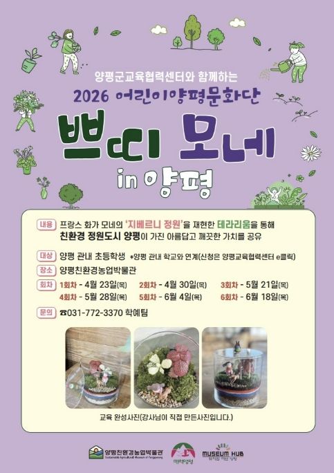 뉴한국방송뉴스통신사 신유철기자 기자 | 양평친환경농업박물관은 오는 4월부터 6월까지 양평 관내 초등학생을 대상으로 2026년 교육 프로그램 ‘어린이 양평문화단, 쁘띠 모네 in 양평’을 운영한다고 밝혔다.