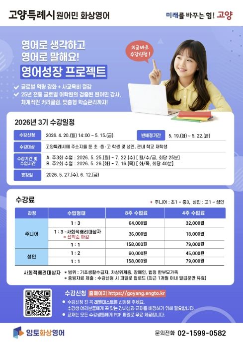 이 프로그램은 초등학생부터 성인까지 고양시민이라면 누구나 참여할 수 있으며, 수강신청은 ‘고양특례시 원어민 화상영어’ 누리집에서 하면 된다.