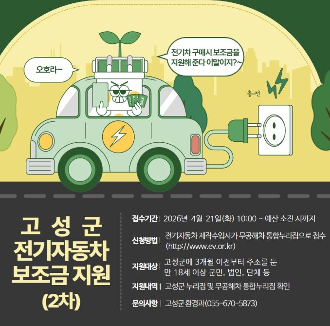 뉴한국방송뉴스통신사 신유철기자 기자 | 고성군은 4월 21일부터 전기자동차 보급사업 2차 신청을 앞당겨 추진한다고 밝혔다. 전기자동차 수요 증가와 대기질 개선에 대응하기 위한 조치다.