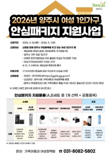 뉴한국방송뉴스통신사 신유철기자 기자 | 양주시는 관내 여성 1인 가구 등 범죄 취약 여성 가구의 안전한 일상을 지원하기 위해 ‘2026년 양주시 여성 1인 가구 안심패키지 지원사업’을 추진한다.