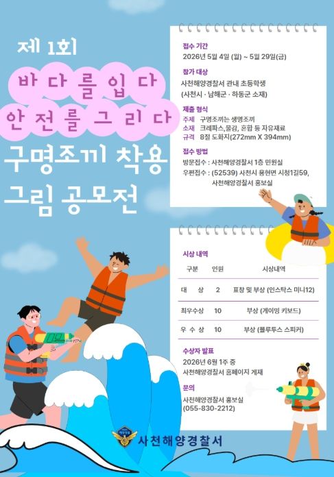 사천해양경찰서가 주최하는 이번 대회는 “구명조끼는 생명조끼”라는 슬로건 아래 구명조끼 착용 문화를 정착시키고, 어린이들에게 해양 안전의 중요성을 전달하고자 하는 바람이 담겨있다. 그림 공모전 주제는 ▲구명조끼를 착용한 나와 우리 가족의 안전한 바다 이야기 ▲구명조끼 착용 생활화를 주제로 한 창의적 표현 ▲안전한 바다, 함께하는 해양경찰 등이다.
