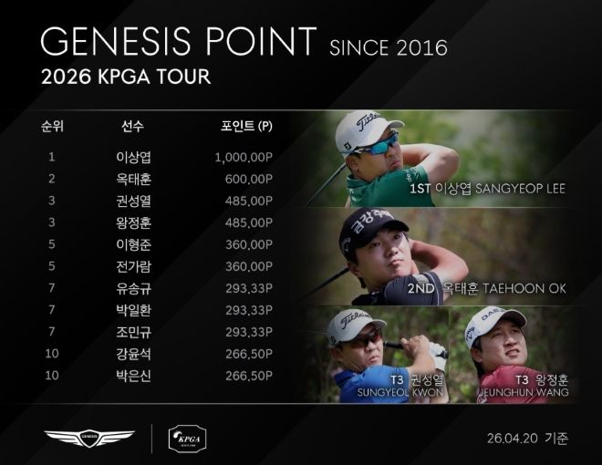 권성열(40)과 왕정훈(31.DAEJIN)이 485포인트로 제네시스 포인트 3위, 이형준(34.웰컴저축은행), 전가람(31.LS)이 360포인트로 제네시스 포인트 5위에 이름을 올렸다.