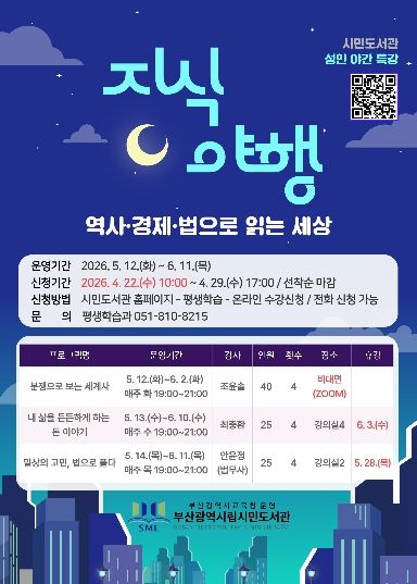 뉴한국방송뉴스통신사 신유철기자 기자 | 부산광역시립시민도서관은 오는 5월 12일부터 6월 11일까지 낮 시간 도서관 이용이 어려운 성인 90명을 대상으로 도서관 강의실과 온라인(ZOOM)을 통해 ‘지식 야행’특강을 운영한다.