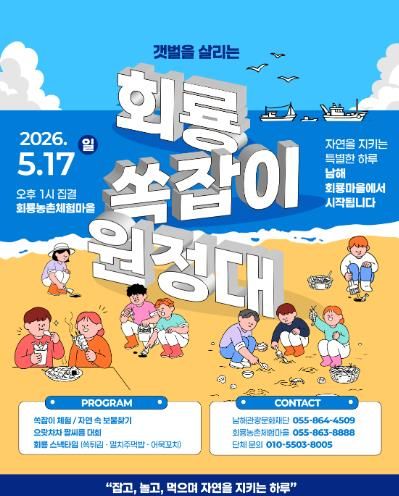 뉴한국방송뉴스통신사 신유철기자 기자 | 남해관광문화재단은 ‘2026 지역민 주도 소규모 축제 개최 지원 사업’의 일환으로 오는 5월 17일 일요일 오후 1시 ‘갯벌을 살리는 회룡 쏙잡이 원정대’ 축제를 개최한다.