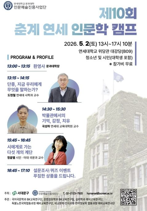 뉴한국방송뉴스통신사 신유철기자 기자 | 서대문구가 연세대학교 문과대학과 공동으로 5월 2일 오후 1시부터 5시 10분까지 연세대 위당관 대강당(B09호)에서 ‘제10회 연세 인문학 캠프’를 개최한다.