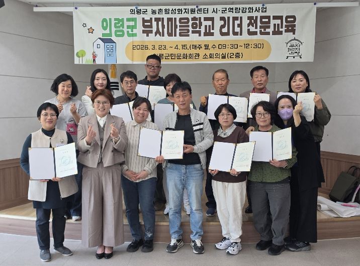 뉴한국방송뉴스통신사 신유철기자 기자 | 의령군은 지난 3월부터 추진해 온 ‘2026년 부자마을학교 리더 전문교육’을 마무리하고 12명의 수료생을 배출했다고 밝혔다.