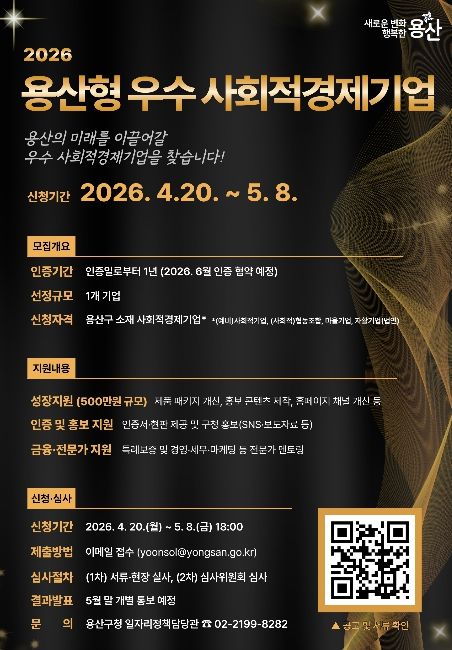 박희영 용산구청장은 “이번 사업은 지역사회에 기여한 사회적경제기업의 성과를 공식적으로 인정하고 성장 기반을 마련하기 위한 것”이라며 “앞으로도 구민과 함께 성장하는 사회적경제 생태계 조성을 위해 다양한 지원을 이어가겠다”고 말했다.