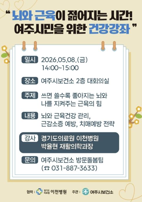 뉴한국방송뉴스통신사 신유철기자 기자 | 여주시보건소 건강증진과는 오는 5월 8일 오후 2시, 보건소 2층 대회의실에서 여주시민을 위한 건강강좌 '뇌와 근육이 젊어지는 시간!'을 개최한다고 밝혔다.