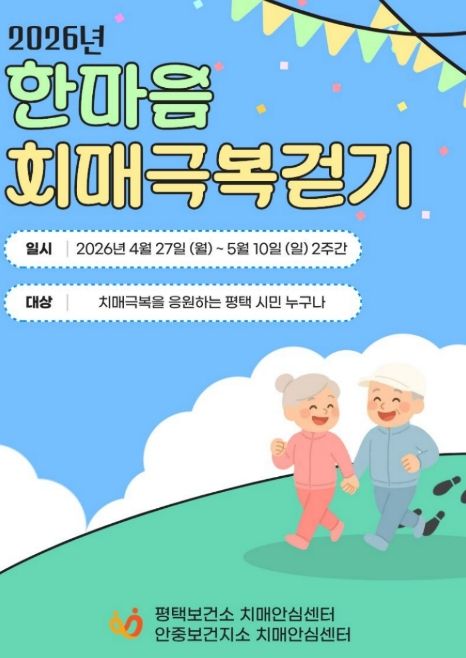 뉴한국방송뉴스통신사 신유철기자 기자 | 평택보건소 치매안심센터와 안중보건지소 치매안심센터에서는 지역 주민의 치매 예방과 인식개선을 위해 녪년 한마음 치매극복 걷기 행사’를 오는 4월 27일부터 5월 10일까지 2주간 진행한다.