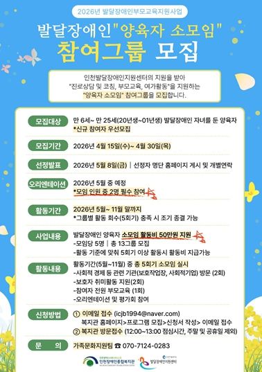 뉴한국방송뉴스통신사 신유철기자 기자 | 인천시사회서비스원 소속 인천장애인종합복지관은 ‘발달장애인 양육자 소모임’ 참여자를 모집한다고 21일 밝혔다.