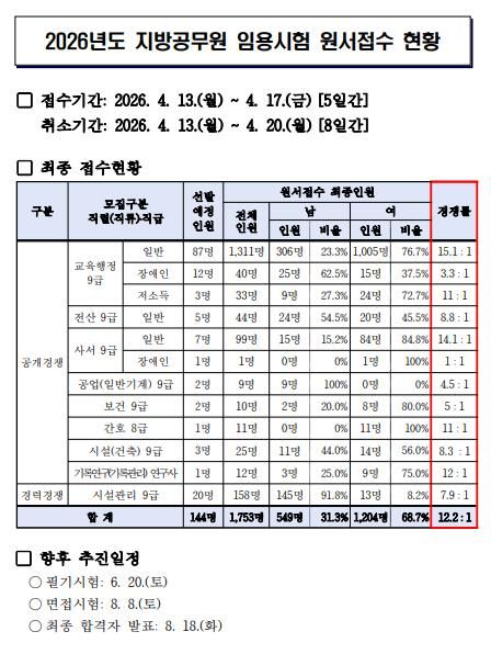 뉴한국방송뉴스통신사 신유철기자 기자 | 부산광역시교육청은 지난 13일부터 17일까지 실시한 ‘2026년도 지방공무원 임용시험’ 원서접수 결과 144명 선발에 1,753명이 지원해 평균 12.2대 1의 경쟁률을 보였다고 밝혔다.