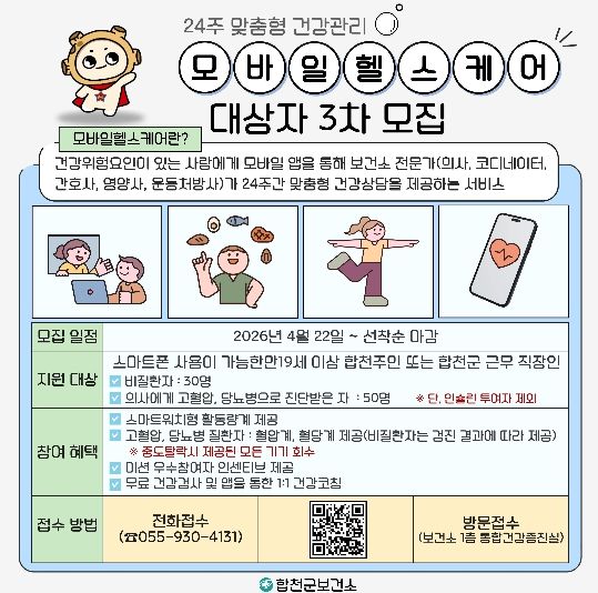 뉴한국방송뉴스통신사 신유철기자 기자 | 합천군보건소(소장 안명기)는 22일부터 모바일헬스케어 대상자 3차 모집을 시작한다.