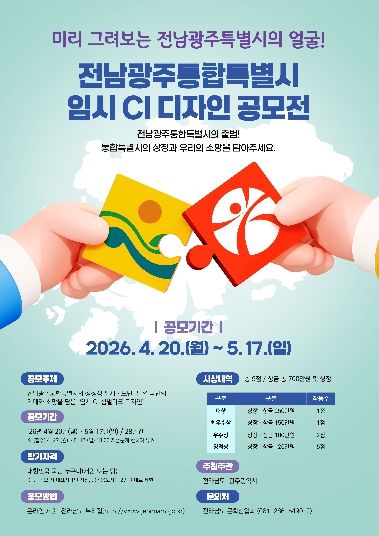 뉴한국방송뉴스통신사 신다은기자 기자 | 전라남도와 광주광역시는 통합특별시의 상징성을 나타내는 전남광주통합특별시 임시 CI 디자인을 5월 17일까지 28일간 전국민을 대상으로 공모한다고 밝혔다.