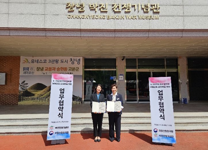 뉴한국방송뉴스통신사 신유철기자 기자 | 창녕군 박진전쟁기념관은 21일, 국립산청호국원(원장 김경나)과 업무협약을 체결하고, 6‧25전쟁의 역사적 가치 계승과 호국보훈 문화 확산을 위한 전시 및 교육 협력 체계를 구축했다.
