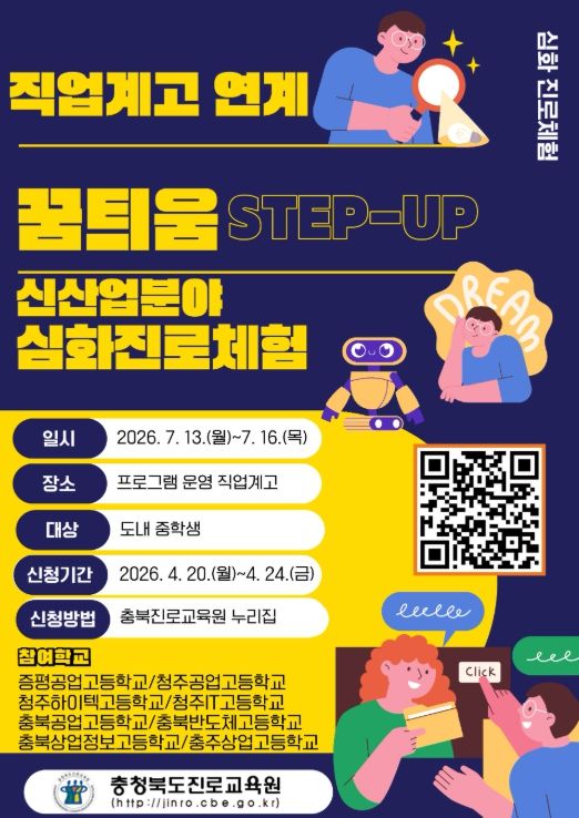 뉴한국방송뉴스통신사 권영분기자 기자 | 충청북도교육청 직속기관 진로교육원은 미래 신산업 분야에 대한 학생들의 진로설계 역량을 높이기 위해 '2026. 꿈틔움 STEP-UP 직업계고 연계 신산업 분야 심화 진로체험'을 운영한다고 밝혔다.