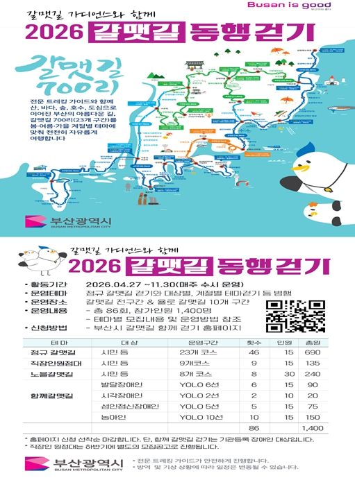 부산 전역을 잇는 ‘갈맷길 700리’ 정규 23개 코스와 ‘욜로(YOLO)갈맷길’ 10개의 테마 코스를 포함한 4개 프로그램, 총 86회차로 시민과 관광객 1천400여 명이 함께할 예정이다.