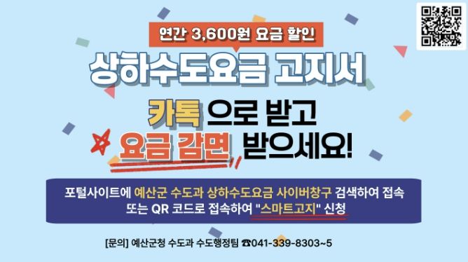 뉴한국방송뉴스통신사 신태공 기자 | 예산군은 수도요금을 카카오톡 알림톡으로 간편하게 확인하고 납부할 수 있는 ‘스마트고지 서비스’ 이용을 늘리기 위해 홍보를 강화한다고 밝혔다.