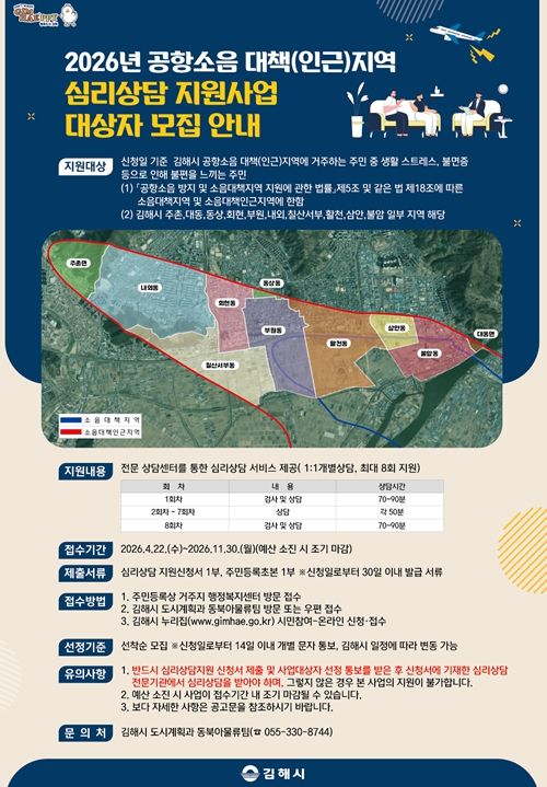 뉴한국방송뉴스통신사 신유철기자 기자 | 김해시는 공항소음 대책(인근)지역 주민을 대상으로 심리상담 지원사업 참여자를 모집한다고 22일 밝혔다.
