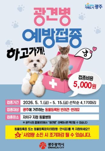 뉴한국방송뉴스통신사 김성의 기자 | 광주광역시는 반려동물과 시민의 건강을 지키기 위해 5월 1일부터 15일까지 ‘봄철 광견병 예방접종 사업’을 추진한다.