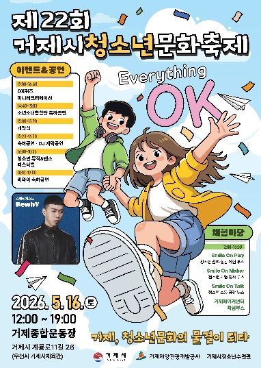 뉴한국방송뉴스통신사 신유철기자 기자 | 거제시는 오는 2026년 5월 16일 12:00~19:00, 거제종합운동장(우천 시 거제시체육관)에서 제22회 거제시청소년문화축제 “Everything OK”를 개최한다.