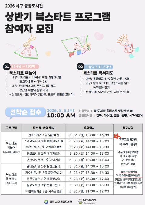 뉴한국방송뉴스통신사 신태공 기자 | 대전 서구 5개 공공도서관(갈마·가수원·둔산·월평·어린이)은 영유아와 어린이들의 건강한 독서 습관 형성을 돕기 위해 2026년 상반기 ‘북스타트 프로그램’을 운영한다.