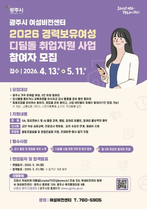 뉴한국방송뉴스통신사 신유철기자 기자 | 광주시는 지역 내 경력보유여성의 사회 재진출과 취업 역량 강화를 위해 ‘2026 경력보유여성 디딤돌 취업 지원 사업’ 참여자를 오는 5월 11일까지 모집한다고 22일 밝혔다.