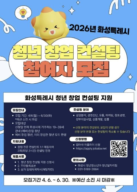 뉴한국방송뉴스통신사 신유철기자 기자 | 화성특례시는 오는 6월 30일까지 ‘2026년 청년 창업 컨설팅 지원사업’ 참여자를 모집한다.