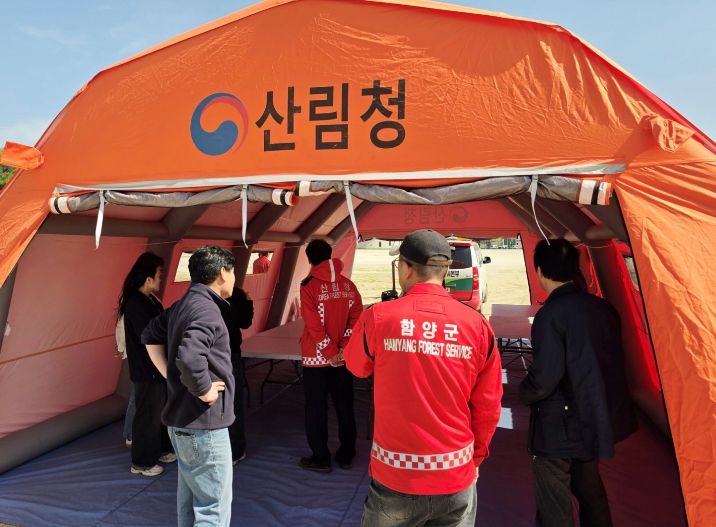 이번 훈련은 산불 발생 상황을 가정해 에어텐트와 지휘차를 설치·운영하며 현장 지휘 본부 운영체계를 점검하고, 유관기관 간 협력 대응 능력을 강화하기 위해 마련됐다.