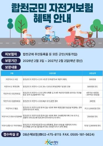 장재혁 합천군수 권한대행은 “자전거 이용 증가에 따라 사고 위험도 함께 높아지고 있는 만큼, 군민 자전거보험을 통해 사고 발생 시 경제적 부담을 덜고 보다 안전하게 자전거를 이용할 수 있도록 지원하고 있다”며 “앞으로도 자전거도로 정비와 안전시설 확충 등 다양한 정책을 통해 안전한 자전거 환경 조성에 힘쓰겠다”고 밝혔다.