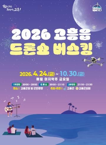 뉴한국방송뉴스통신사 신다은기자 기자 | 고흥군은 ‘2026 고흥읍 드론쇼 버스킹 공연’을 오는 4월 24일부터 10월 24일까지 7개월간 매월 마지막 주 금요일 고흥군청 앞 군민광장에서 개최한다고 밝혔다.