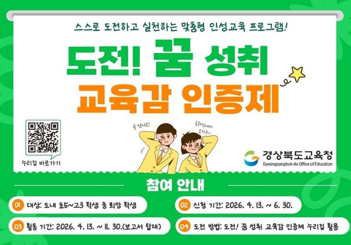 올해로 4회째를 맞이하는‘도전! 꿈 성취 교육감 인증제’는 경북형 성장 중심 인성 특화 프로그램이다. 인문.봉사.체육.예술.외국어.통합 등 다양한 분야의 인증 프로그램을 통해 학생들이 스스로 목표를 설정하고 도전에 참여하고 있으며, 그 결과 지금까지 초·중·고 학생 463명이 금장, 은장, 동장 인증을 받았다.