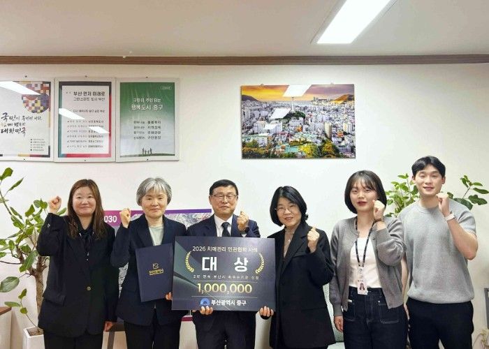 뉴한국방송뉴스통신사 신유철기자 기자 | 부산 중구는 2026년 치매관리 민관협력 우수사례 공모전에서‘소지역 맞춤형 기억동행, 중구형 치매보듬마을’사례로 대상을 수상했다고 밝혔다.