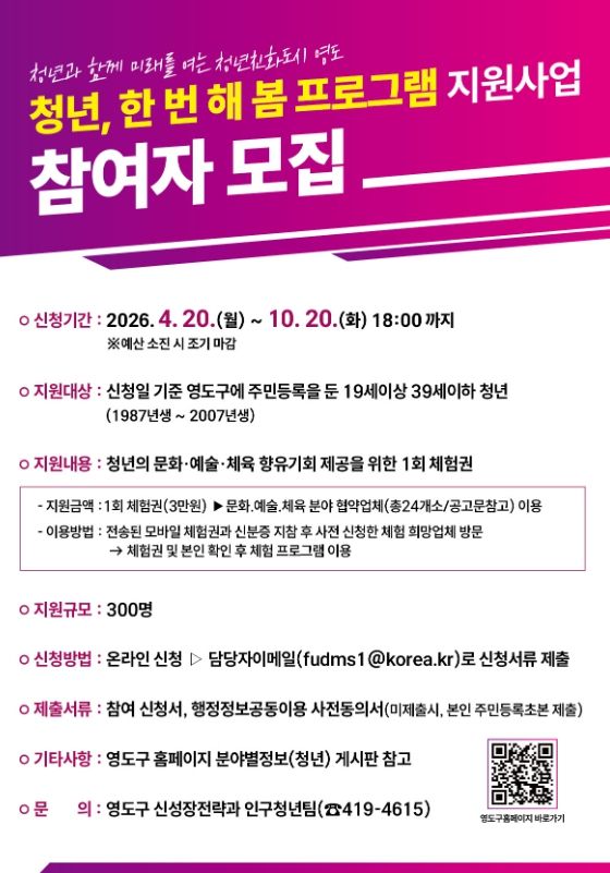 뉴한국방송뉴스통신사 신유철기자 기자 | 부산 영도구는 청년들에게 문화 향유 기회를 제공하고 지역 청년문화 활성화를 도모하기 위해 '청년, 한 번 해 봄 프로그램 지원사업' 참여자를 이달 20일부터 10월 20일까지 모집한다고 밝혔다.
