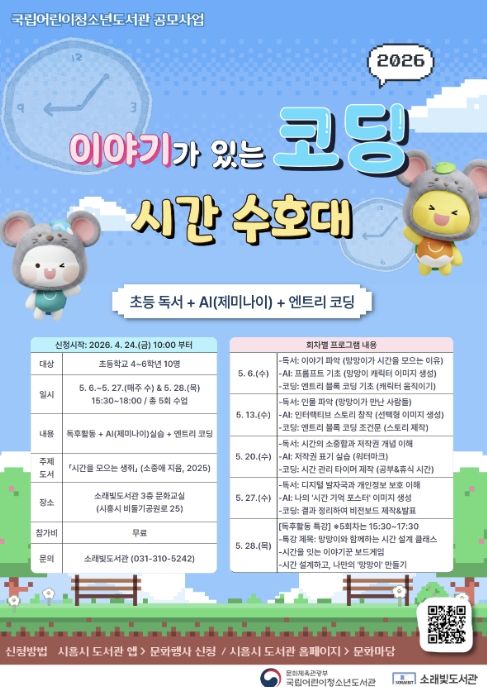 뉴한국방송뉴스통신사 신유철기자 기자 | 시흥시 소래빛도서관은 국립어린이청소년도서관이 주최하는 ‘2026년 이야기가 있는 코딩’ 공모사업 운영기관으로 선정돼 오는 5월 6일부터 어린이 대상 독서·디지털 융합 프로그램을 운영한다.