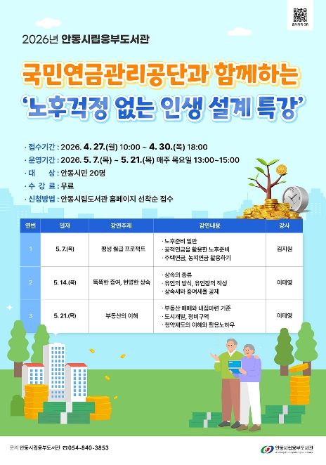 안동시립도서관 관계자는 “이번 특강은 시민이 막연하게만 느꼈던 노후 준비를 체계적이고 종합적으로 계획할 수 있도록 돕기 위해 마련했다”며 “가까운 미래를 진지하게 고민하는 신중년 세대의 많은 관심과 참여를 기대한다”고 전했다.