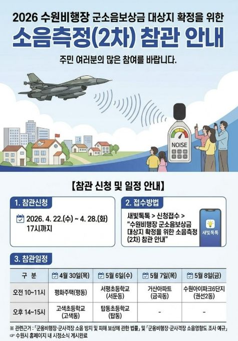 뉴한국방송뉴스통신사 신유철기자 기자 | 수원특례시가 수원비행장 인근 주민들의 소음 피해 보상 근거가 될 국방부의 ‘수원비행장 소음 영향도 조사 2차 소음측정’ 주민 참관 참여자를 모집한다. 4월 28일까지 새빛톡톡으로 신청할 수 있다.