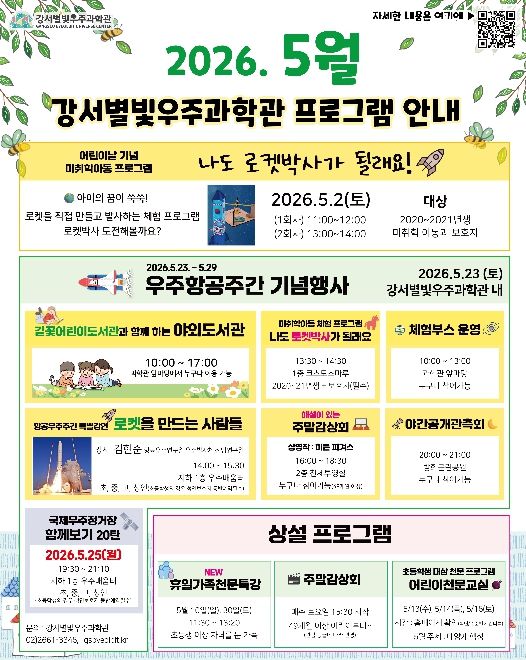 뉴한국방송뉴스통신사 신유철기자 기자 | 서울 강서구 강서별빛우주과학관은 5월 어린이날과 우주항공주간을 맞아 어린이부터 성인까지 온 가족이 함께 우주의 신비를 즐길 수 있는 특별 프로그램을 운영한다.