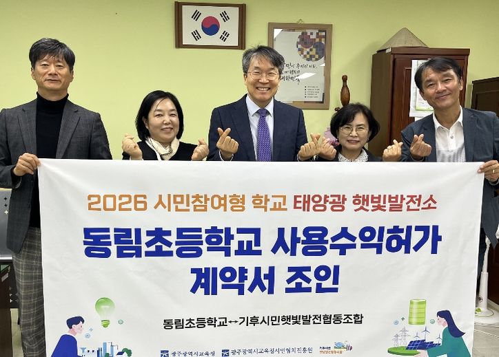 광주시교육청시민협치진흥원(이하 시민협치진흥원)은 지난 22일 동림초등학교 교장실에서 기후시민햇빛발전협동조합과 ‘탄소중립 실천 및 생태전환교육 활성화를 위한 학교 햇빛발전소 구축 업무협약’을 체결했다.