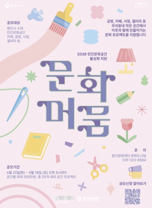 뉴한국방송뉴스통신사 신유철기자 기자 | 용인문화재단은 오는 5월 16일까지 ‘민간문화공간 활성화 지원사업 '문화머뭄'’의 참여 공간을 모집한다고 밝혔다. 지난해 25개소 공간에서 203회의 프로그램을 운영하며 2,101명의 시민 참여를 이끌어낸 ‘문화머뭄’ 사업은 올해 재단 자체 재원을 매칭하여 총 25개소의 민간문화공간을 선정하고, 공간별 최대 300만 원까지 프로젝트 운영비를 지원할 예정이다.