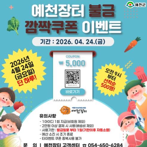 이벤트는 24일 오전 9시부터 예천장터 회원을 대상으로 선착순 500명에게 5,000원 할인쿠폰이 지급되며, 해당 쿠폰은 배송비를 제외한 결제 금액이 2만 원 이상일 경우 즉시 사용할 수 있다.