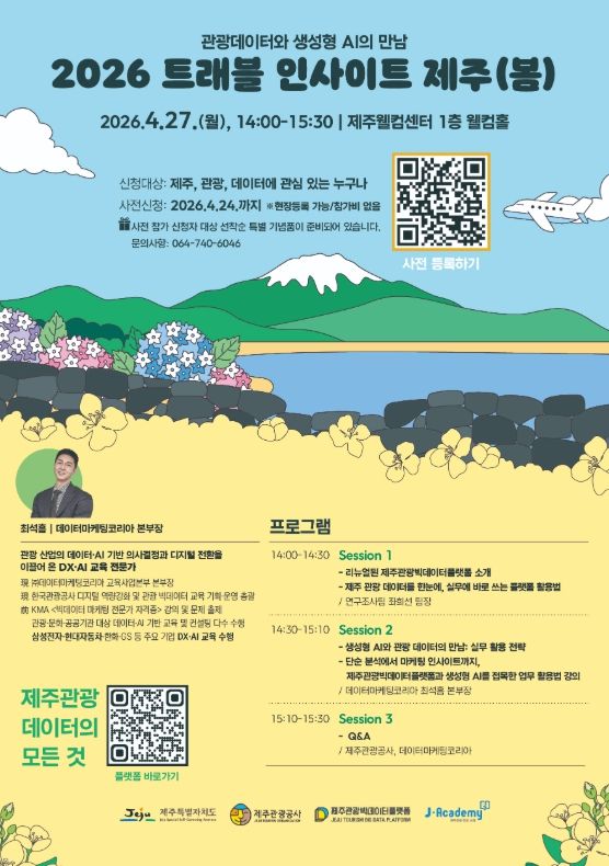 뉴한국방송뉴스통신사 신유철기자 기자 | 제주특별자치도와 제주관광공사(사장 고승철)는 오는 27일 제주웰컴센터에서 관광사업체, 공공기관, 학계 등 관광과 데이터에 관심 있는 분들을 대상으로 데이터 기반 의사결정을 지원하기 위한 ‘2026 트래블 인사이트 제주(봄)’ 세미나를 개최한다고 23일 밝혔다. 이번 세미나에선 새롭게 개편한 제주관광 빅데이터 플랫폼(data.ijto.or.kr)의 활용 방안을 소개하고, 생성형 인공지능(AI)과 관광데이터를 결합한 실무 활용 전략을 공유한다.