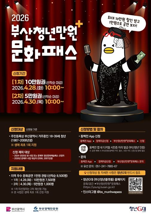 박형준 시장은 “'부산청년만원+문화패스'는 지난해 단 8분 만에 마감될 만큼 청년들의 체감 만족도가 입증된 부산만의 대표적인 청년문화 모델”이라며, “올해도 알찬 라인업을 준비한 만큼, 신청을 희망하는 청년들은 미리 준비해 소중한 문화 향유의 기회를 놓치지 않길 바란다”라고 전했다.