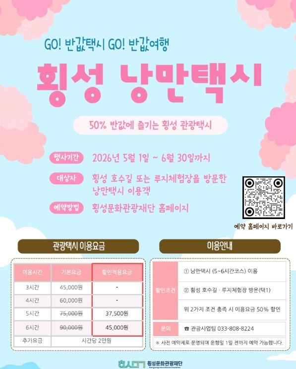 뉴한국방송뉴스통신사 양호선기자 기자 | 횡성군과 횡성문화관광재단이 운영하는 횡성 낭만택시가 오는 5월 1일부터 6월 30일까지 이용요금 50% 할인 행사를 실시한다고 밝혔다.