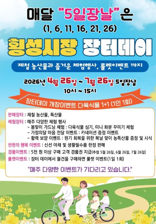 뉴한국방송뉴스통신사 양호선기자 기자 | 횡성군이 전통시장 내 고객 유입을 촉진하고 지역 경제에 활력을 불어넣기 위해 오는 4월 26일부터 7월 26일까지 ‘2026 횡성전통시장 장터데이’ 행사를 개최한다.