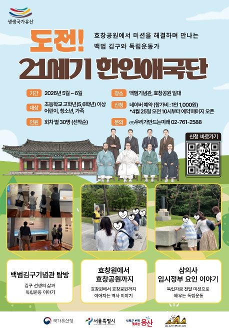 ’효창공원이 생생, 독립운동이 생생‘은 ▲도전! 21세기 한인애국단 ▲효창공원의 기억, 이봉창 의사와 울림 ▲효창공원 감각 아카이브-나만의 국가유산 다큐 ▲효창공원 이야기 마당 총 4가지 프로그램으로 꾸렸다.